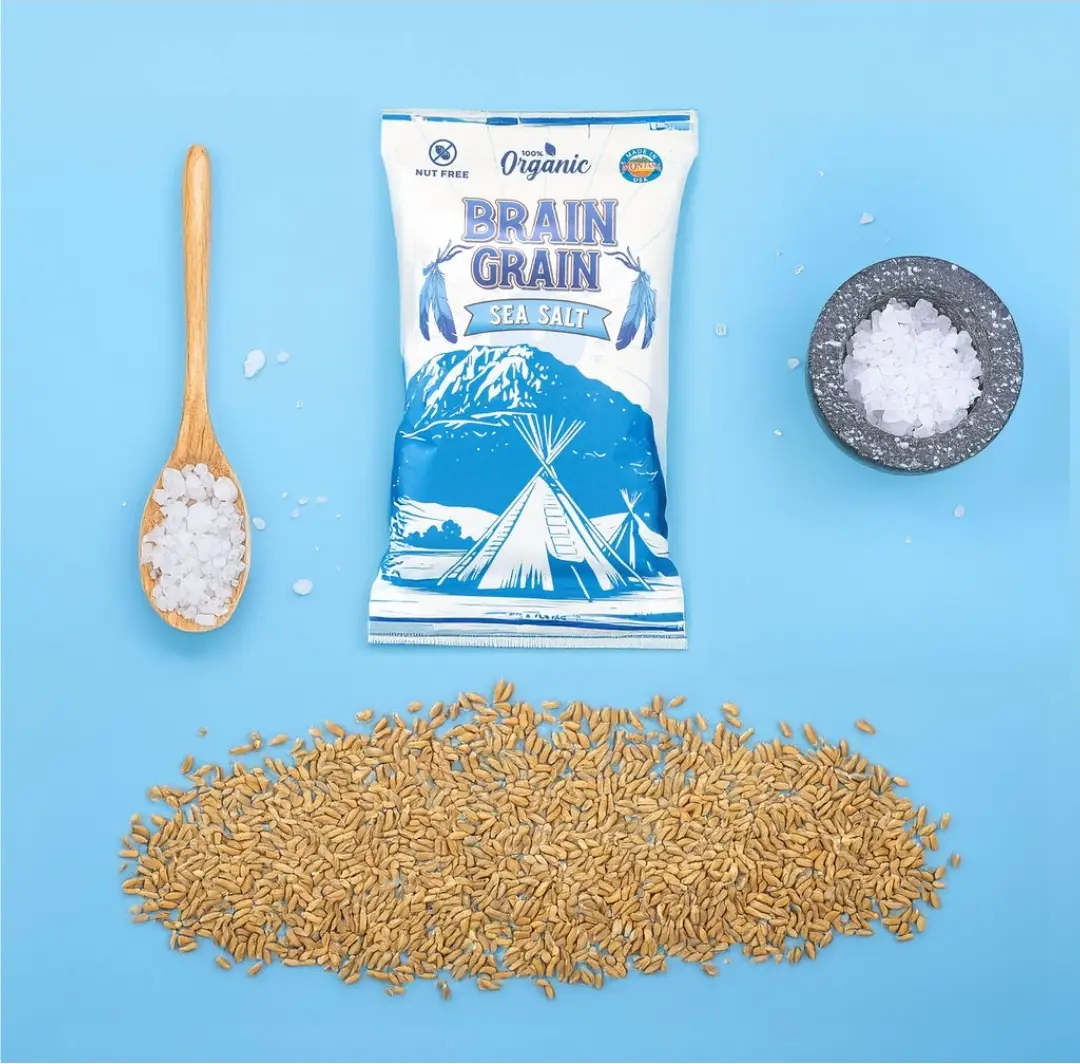 So 2024/2025 he was hired as the business teacher for high school and was able to then get all the ideas we now have from the students. One student in particular Ki-iu Windyboy (pronounced kee-u) blurted out Brain Grain for a new name for this healthy ancient grain snack. Thomas and the others really like the ring to this. The title pretty much speaks for itself.